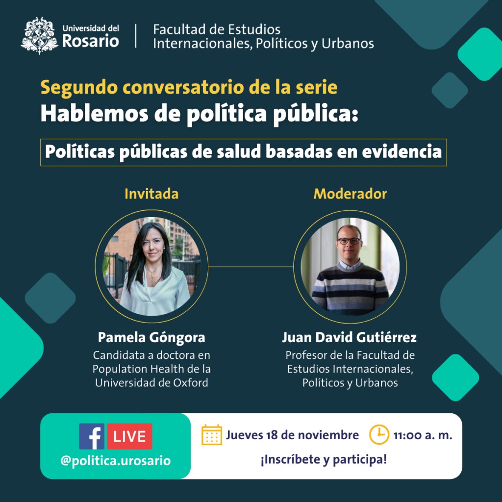 El próximo jueves 18 de noviembre, a partir de las 11:00 horas Bogotá, tendrá lugar la segunda sesión de “Hablemos de política pública”, la serie de conversatorios organizados por la Facultad de Estudios Internacionales, Políticos y Urbanos de la Universidad del Rosario.