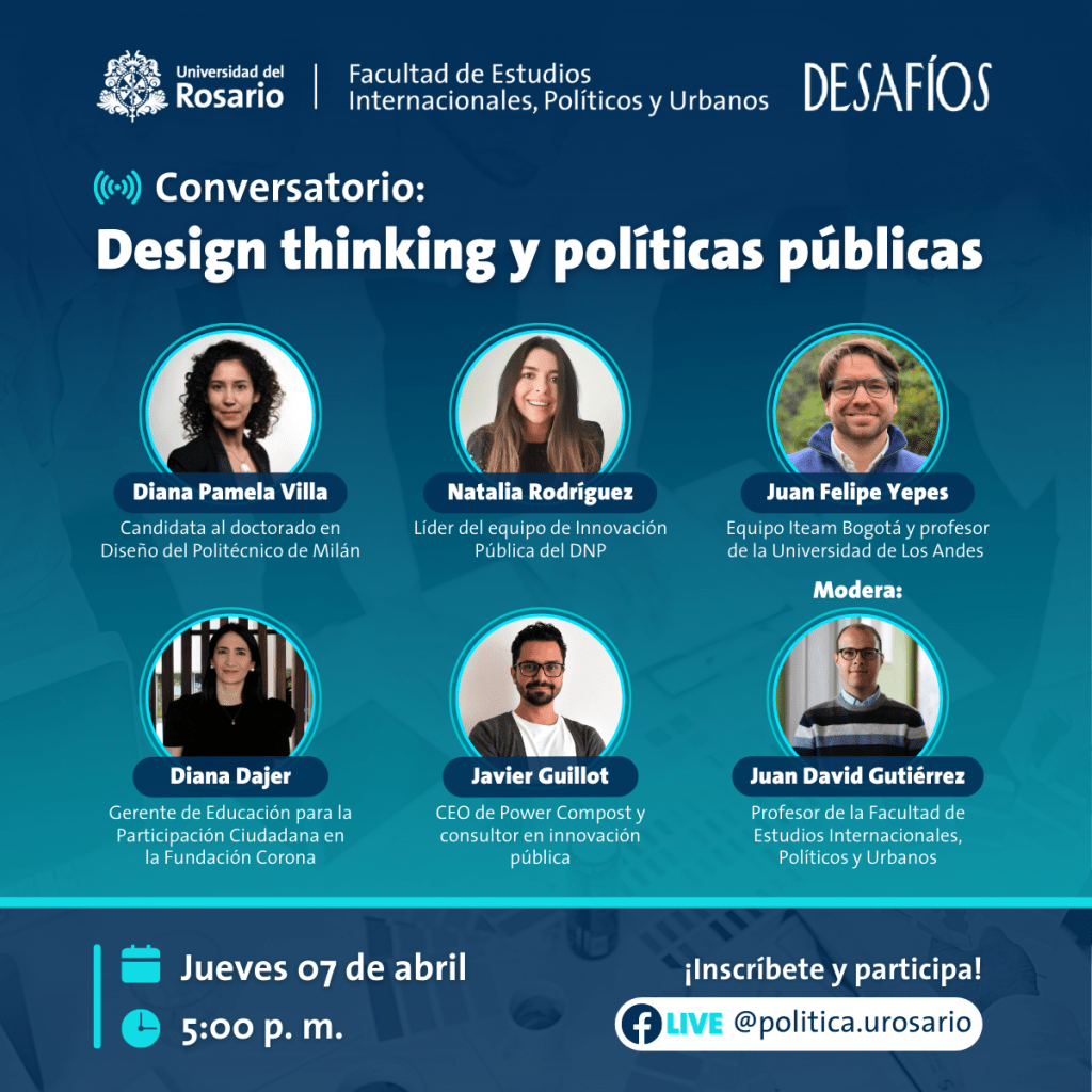 El próximo 7 de abril, a partir de las 17:00 horas, tendré el gusto de moderar un conversatorio sobre los aportes del pensamiento de diseño (design thinking) a los procesos de políticas públicas.